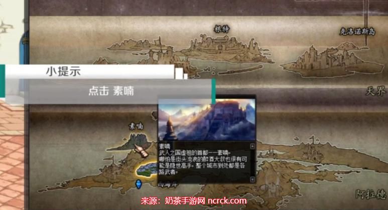 4、在与"素喃"对话后,按下"N键"打开地图。你将能够看到地图上标有西岚所在位置的标记。