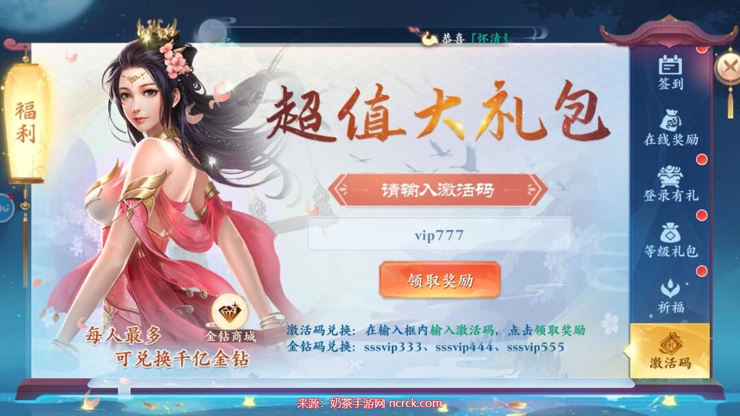 3、在激活码输入框中,输入你所获取的礼包码。