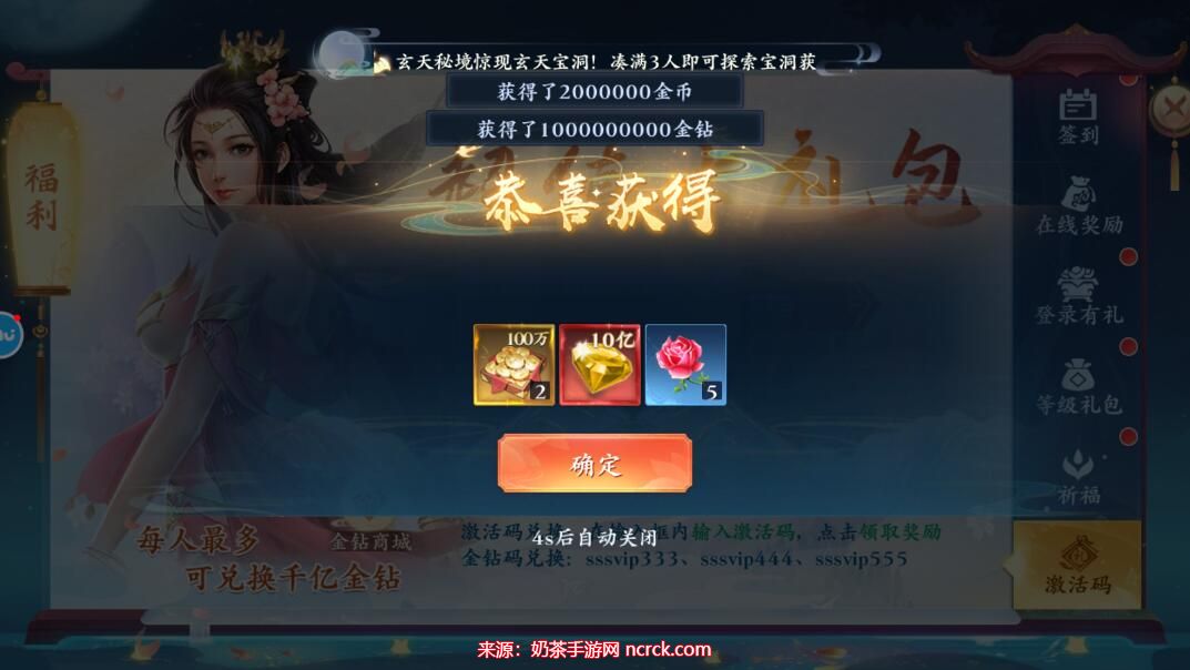 4、点击领取奖励按钮,即可获得元宝和各种道具奖励。