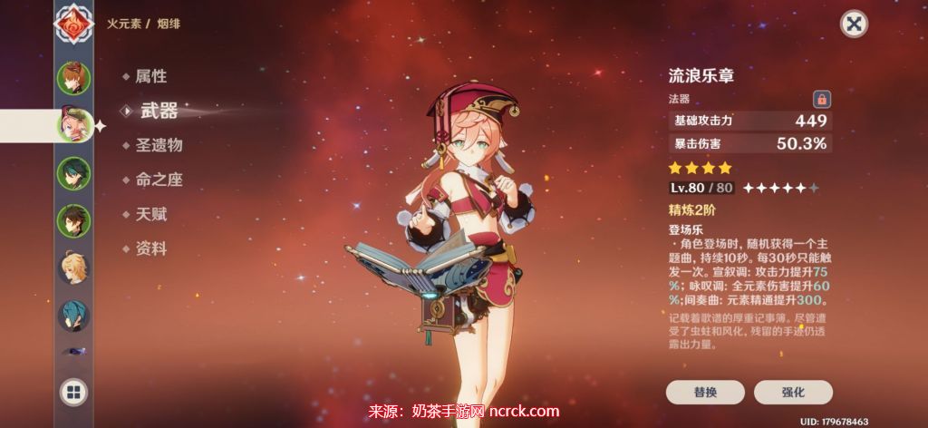 流浪乐章在满精的情况下非常强大,它的伤害可以在一定程度上超过四风原典。然而,增伤效果只持续10秒,需要等待30秒的冷却时间。所以在站场输出方面,整体效益略低于四风原典,但是它的30秒快乐书效果非常不错。对于烟绯来说,流浪乐章无疑是四星武器中最佳的选择。