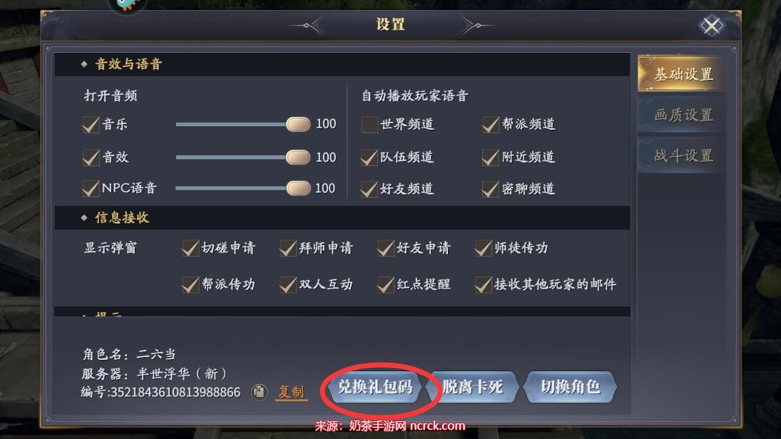3、进入庆余年手游的设置页面后,在页面底部找到"礼兑换码"按钮。
