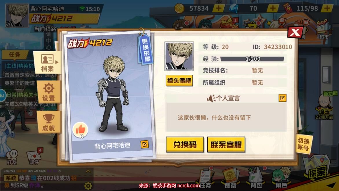 1、首先,进入一拳超人最强之男手游并完成新手任务,在游戏中点击头像,进入玩家信息界面。