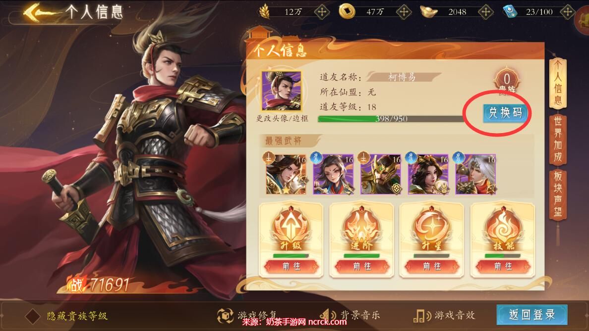 2、进入角色信息界面后,在右侧可以找到兑换码按钮。
