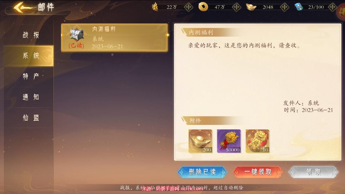 4、输入兑换码后,进入邮件中心,使用一键领取功能,即可领取您的奖励。