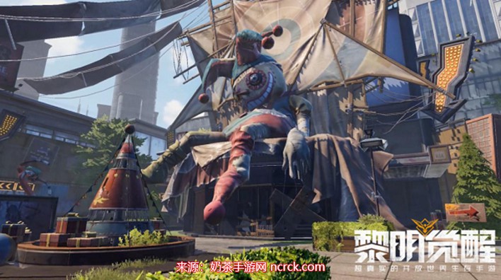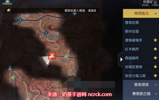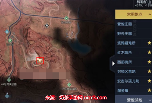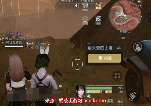 2、在环形地带附近,你会看到一辆汽车。寻找箭头,它就在汽车旁边。注意箭头旁的土堆,挖掘土堆即可获得奶茶图。