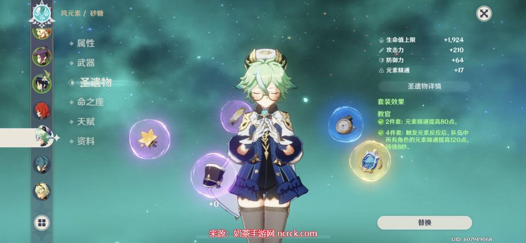 作为一名以风元素伤害为主的法器角色,砂糖非常容易触发「翠绿之影」4件套的减抗效果,从而显著提高整个元素反应队伍的伤害。另外,「教官」4件套可以为自身和全队增加120元素精通,同样可以增加元素反应伤害,适合作为过渡使用。尽管「教官」套装的元素精通加成比一两百的精通更加强大,但它难以获取。