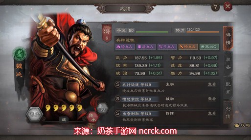 这个战法的被动效果非常强大。在战斗中,当魏延发动准备战法时,有75%的几率减少1回合的准备时间。随着魏延武力的提升,这个几率将会达到100%。此外,在战斗前4回合,主动战法的伤害增加30%,这对于高级魏延来说增伤效果可达到53.6%。这样的增伤效果可以抵消大部分减伤战法的影响。在第5回合,如果魏延的兵力低于50%,他将获得45%的倒戈效果,一直持续到战斗结束。这个战法非常强力,让准备战法变成瞬发战法,并且具备极强的生存能力。