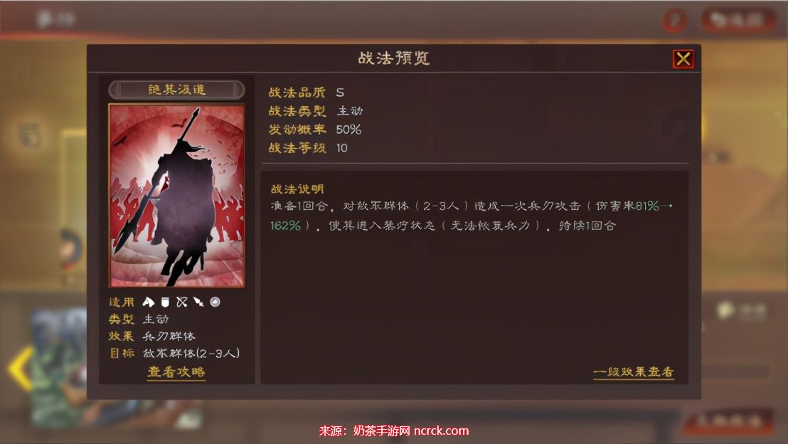 绝其汲道:50%发动几率,对敌军造成群体伤害,并禁止其治疗。
