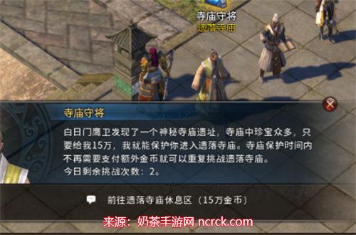 传送NPC:在开放时间内,您可以前往白日门城(362,487)拜访寺庙守将,通过他传送进入遗落寺庙。