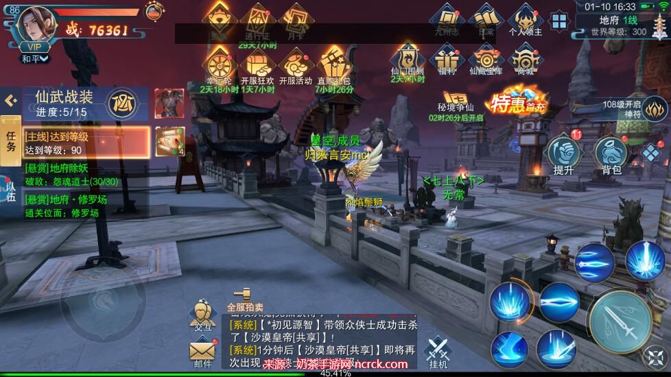 1、在进入三界天骄的主界面后,首先完成新手任务,然后点击右上角的福利按钮。