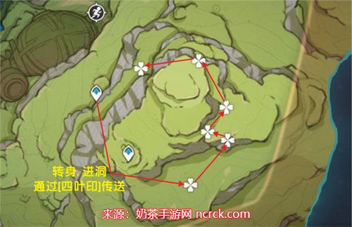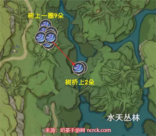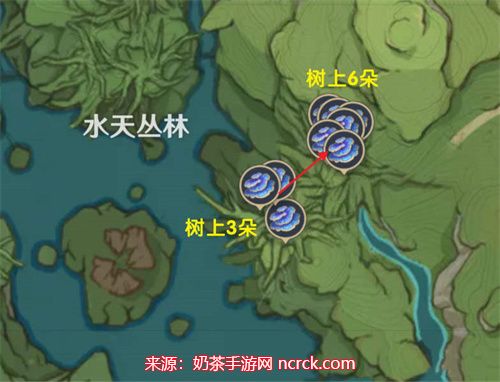7、降诸魔山洞窟: 大部分树王圣体菇在降诸魔山洞窟的上层平台或藤蔓上生长。您可以借助四叶印快速收集。这个区域有6个采集点。
