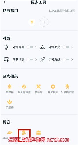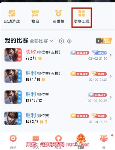 步骤二、登录苹果区账号:打开【王者营地】应用后,使用您的苹果区账号进行登录。然后,点击【战绩】,再选择【更多工具】。