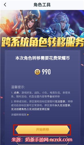 步骤四、使用角色迁移工具:点击【角色工具】后,将跳转到角色迁移工具界面。在这里,您可以开始进行账号转移操作。请注意,此过程将花费990荣耀币,相当于99元人民币。同时,您的账号需要满足一些特定条件,例如在转移之前消耗点券、退出小队和战队等。