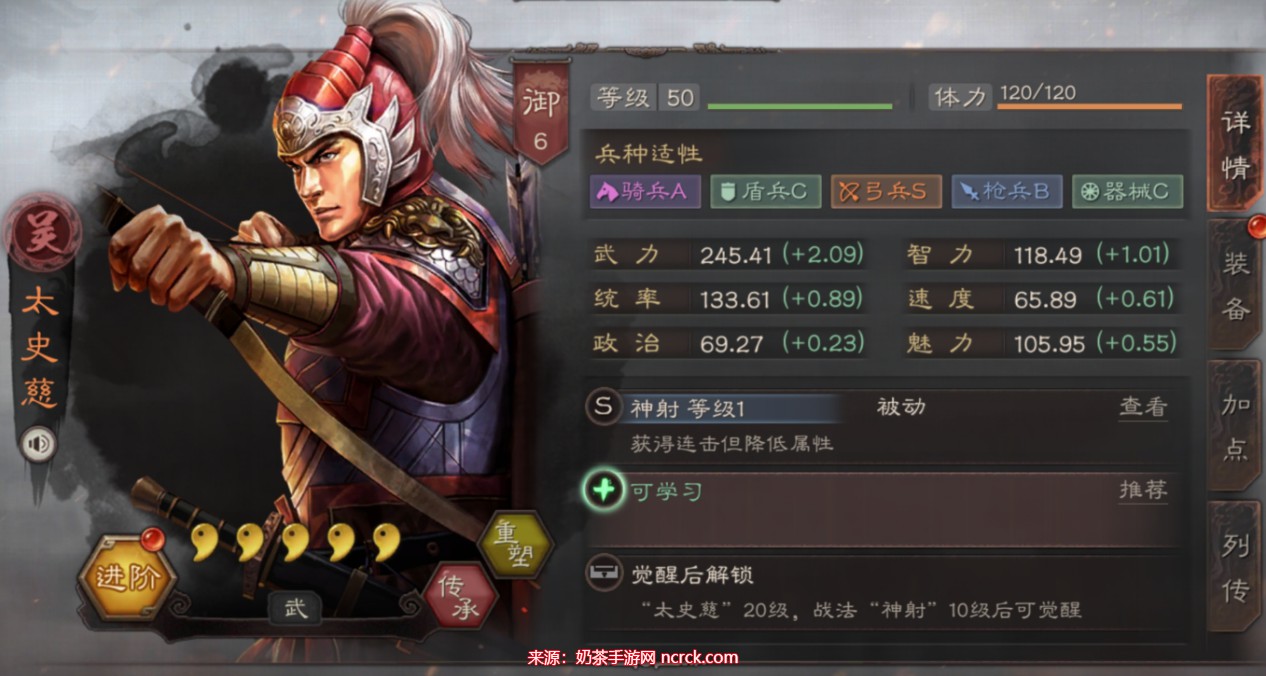2、弯弓饮羽:使用普通攻击后,降低目标的统率属性,并使其进入计穷状态。