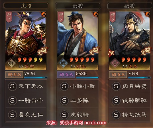 吕布的战法选择了一骑当千和暴戾无仁,郭嘉选择了铁骑驱驰和三势阵,增加了他的输出和控制能力。周泰选择了一力据守和虎豹骑,为队伍提供了额外的防御和伤害能力。这个阵容注重吕布的输出,郭嘉和周泰的辅助能力可以增加团队的防守和控制能力。