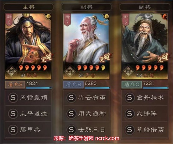 这个阵容注重于控制和减益能力。张角和于吉都可以通过战法削弱敌方,张角的“太平道法”削弱敌方全体攻击,“士别三日”减少敌方怒气,于吉的“锋矢阵”削弱敌方防御,“草船借箭”增加友军攻击。左慈在这个阵容中提供治疗和减益能力,战法“暂避其锋”减少敌方伤害输出,“刮骨疗毒”治疗友军。兵书选择侧重于增加防御、持续战斗能力和减益能力。