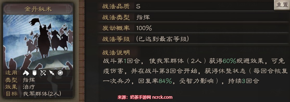 效果: 在战斗开始的前2回合,我军全体获得35%的规避效果,可以免疫伤害。