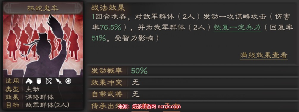 这个战法的伤害和恢复效果都相当不错,发动率高达50%,非常实用,因此出场率也很高。