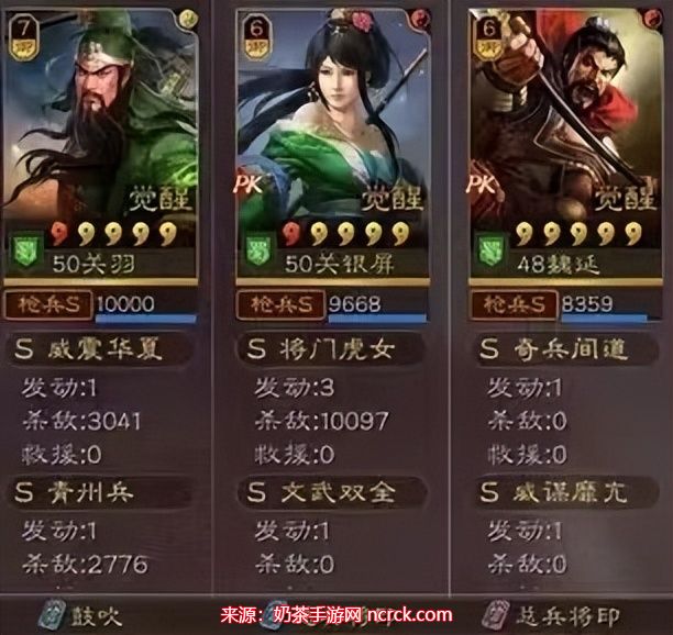 姜维的战法搭配为“夺魂挟魄”和“火炽原燎”,能够迅速击败敌人并削弱其防守。关银屏的战法搭配为“箕形阵”和“轻勇飞燕”,提高了她的输出和机动性。张春华的战法搭配为“婴城自守”和“刮骨疗毒”,提供了治疗和辅助的能力。