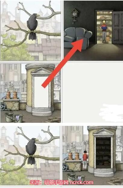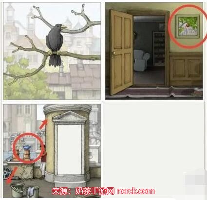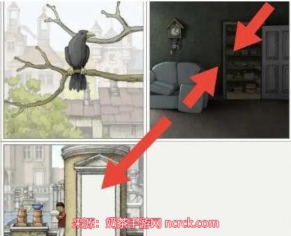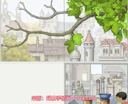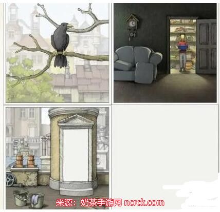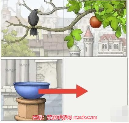 房间场景可以进行缩放,里面还有苹果。一旦放大,玩家会发现它与左边有乌鸦的场景完美结合。这次玩家需要放大蓝色的碗,乌鸦动了起来后,苹果就会掉落到碗里。经过一系列操作后,玩家成功获得了第一个果实。