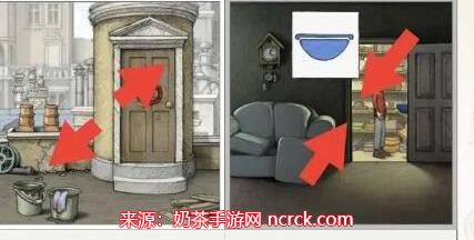 8、继续点击图2墙上的画,和图1连接到一起,放大图3的碗,图3放在图4。