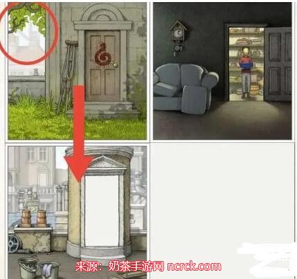 在将所有物品放置到相应位置后,玩家将能够解锁房间。房间内有一个小男孩,最后将左边的场景放大,寻找带有符号的门。该场景移到右边,使得小男孩可以直接出去。接着,一个坐在轮椅上一直注视前方树木的人出现了。点击放大后,这个场景可以拆分到下方,而上方则回到之前的房间。