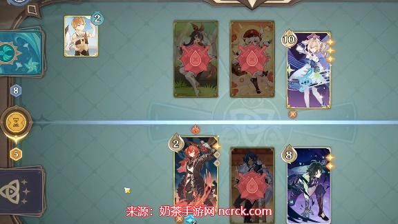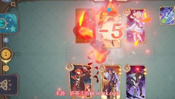 1、芭芭拉的技能牌会给他涂上水元素,因此此时我们迪卢克再使用一个技能造成5点伤害进行蒸发;