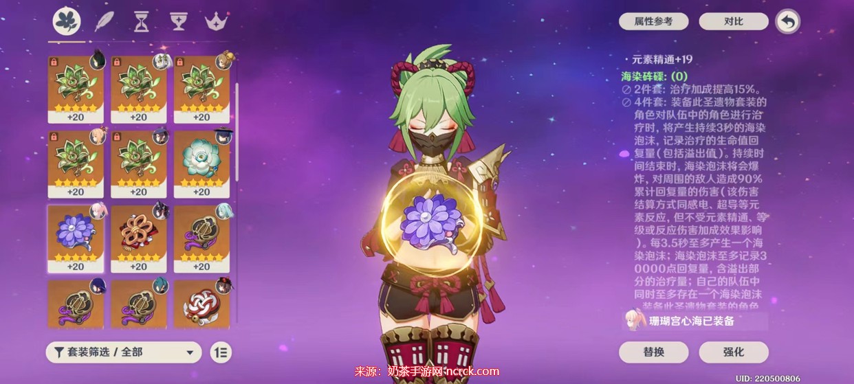 四件套效果:装备这套圣遗物的角色在治疗队伍成员时,会生成持续3秒的海洋染泡沫,记录治疗的生命值回复量(包括溢出部分)。当持续时间结束时,海洋染泡沫会爆炸,对周围敌人造成90%累计回复量的伤害(该伤害计算方式与感电、超导等元素反应相似,但不受元素精通、等级或反应伤害加成影响)。每3.5秒最多生成一个海洋染泡沫;海洋染泡沫最多记录30000点回复量,包括溢出部分;自己的队伍中同时最多存在一个海洋染泡沫。即使久岐忍处于队伍后排,仍然能触发这个效果。