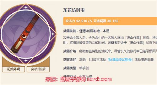 同样提供的是元素熟练度增加,也符合艾尔海森的天赋效果,而且“东花坊细雨”是通过活动获得的,玩家很容易就能得到一把熟练度满的武器。