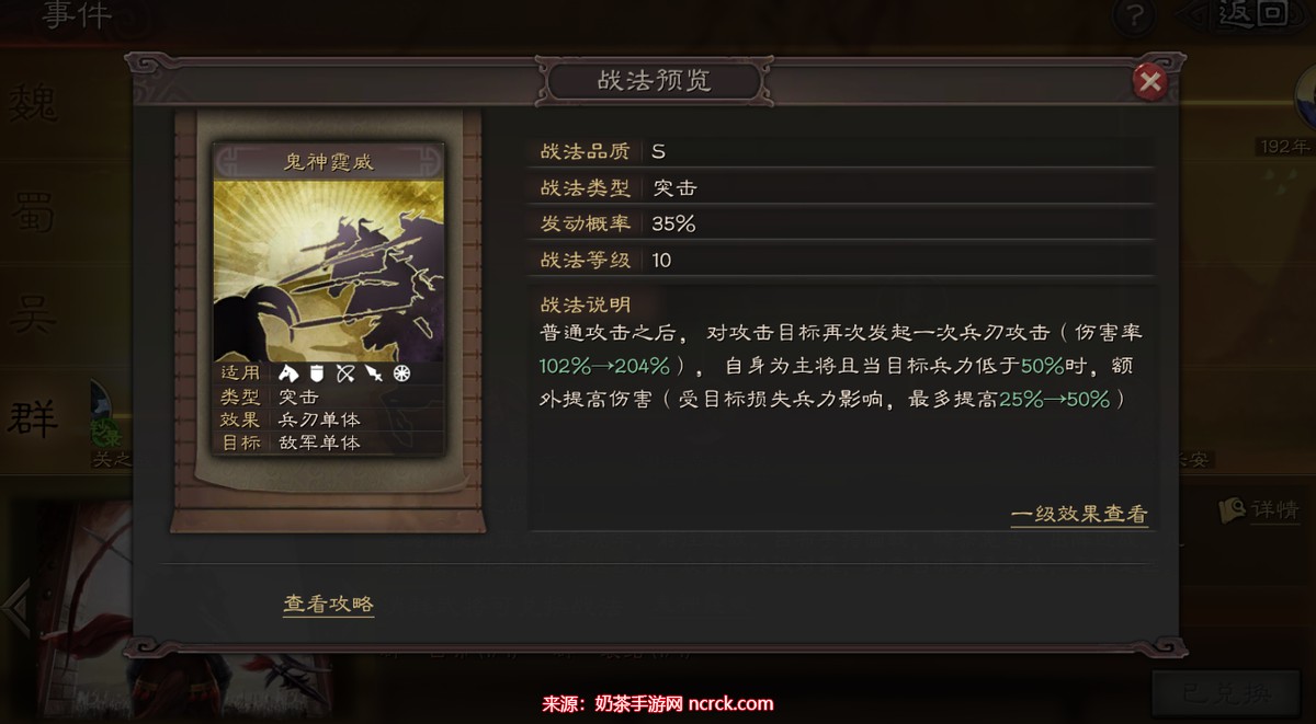 获取方式:消耗武将蜀·良将x10可获取战法。