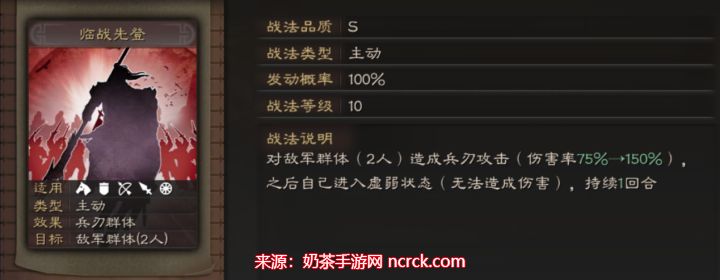 乐进的传承战法是锋矢阵(专属于骑兵、盾兵和枪兵):在战斗中,使我军主将造成的伤害提高30%,受到的伤害提高20%;我军副将造成的伤害降低15%,受到的伤害降低25%。