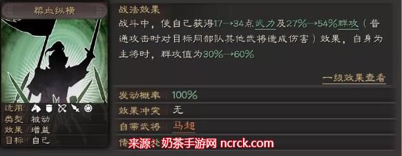 属性提升:该战法将提升马超的武力属性34点。虽然并不高,但也算是有一定的增益效果,可以说聊胜于无。