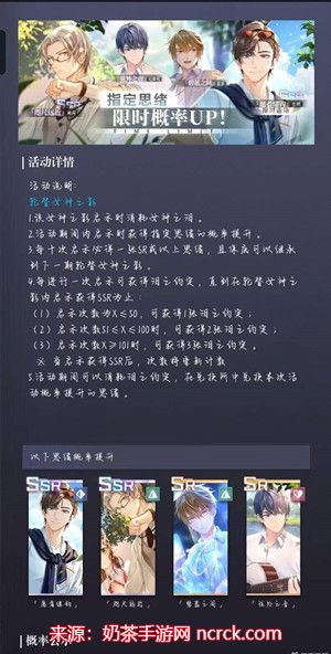 2、四人UP池是四个池子共享同一个保底机制,不会延续到下一个活动。但是会在相应的复刻活动中延续。例如,周年庆典活动就有四个UP池,每个池子都有不同的男主角,不会出现其他男主角的SSR卡。