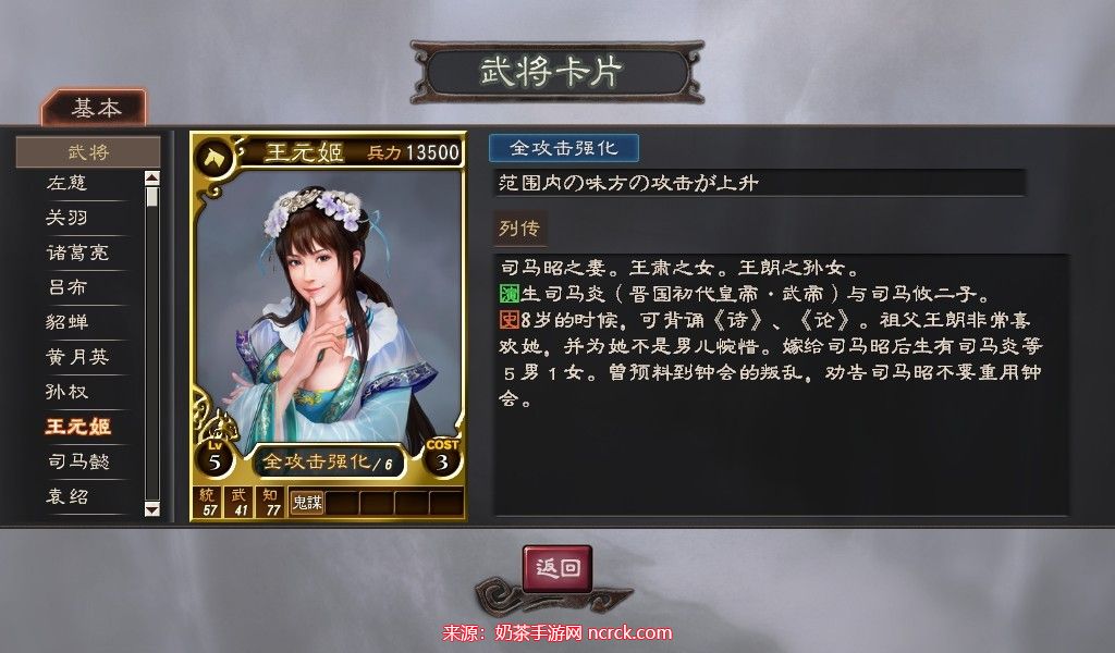 作为女性武将,王元姬在历史记录中的记载相对较少,因此属性设定在中等偏低水平也是可以理解的。她本身的技能已经非常强大,要求她无脑强大但没有历史背景依据,可能会引起玩家们的质疑。