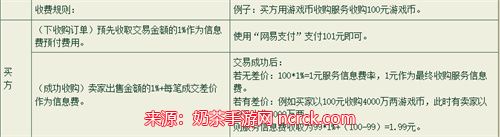 4、【游戏币】收购服务信息费:卖家出售金额*1%+每笔成交差价(若有)。