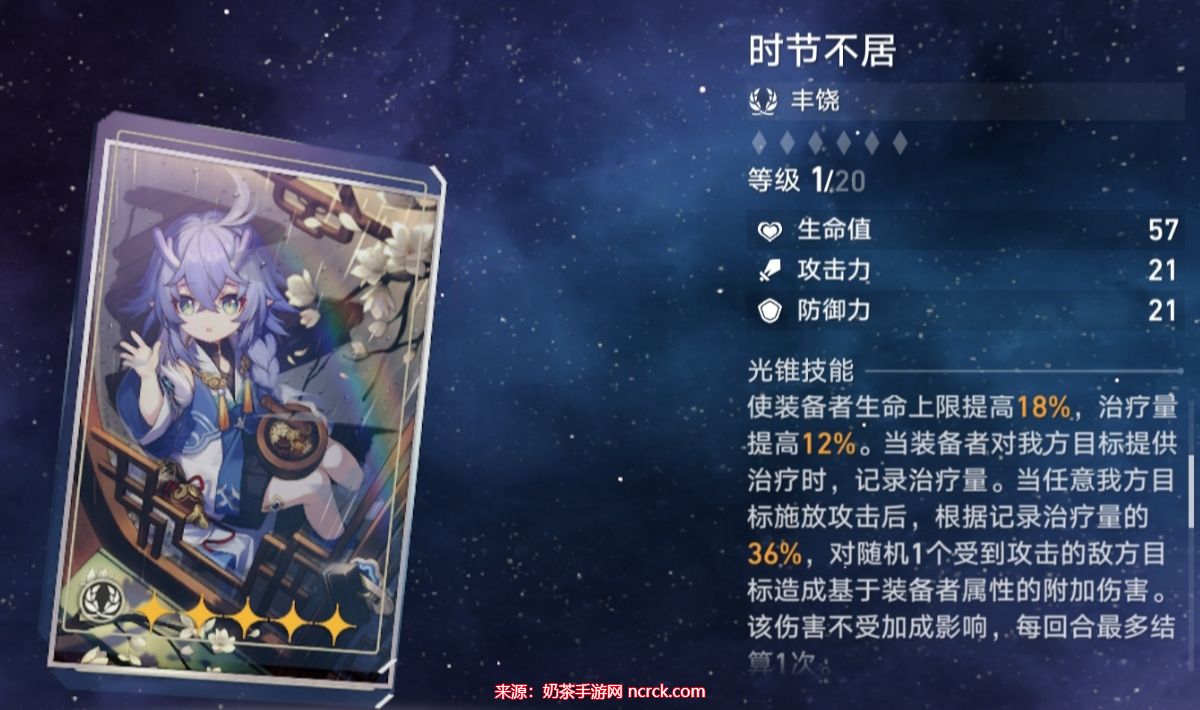 特效分析:增加生命上限可以提升生命加成回复效果,这个特效容易触发,但在只有1点精情的情况下,每次回复仅有2%生命上限的效果,不太实用。因此在大月卡光锥中只适合当做垫底光锥使用,不推荐拿。