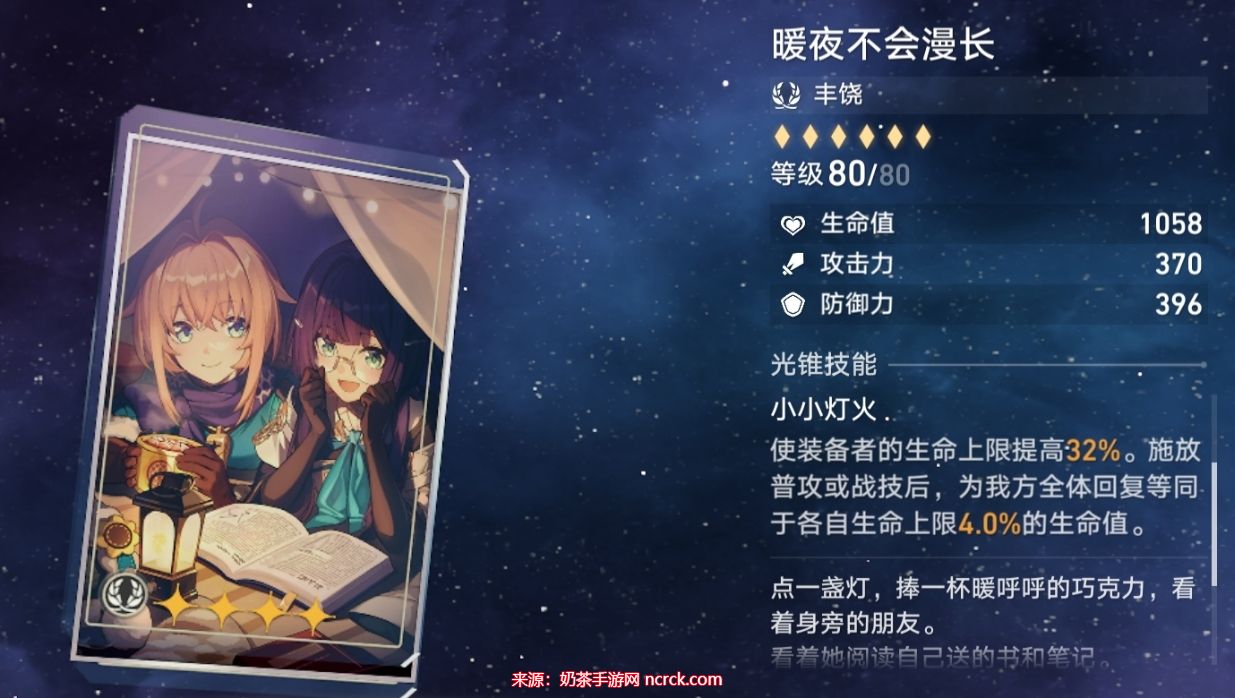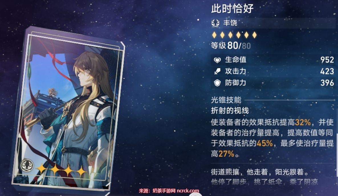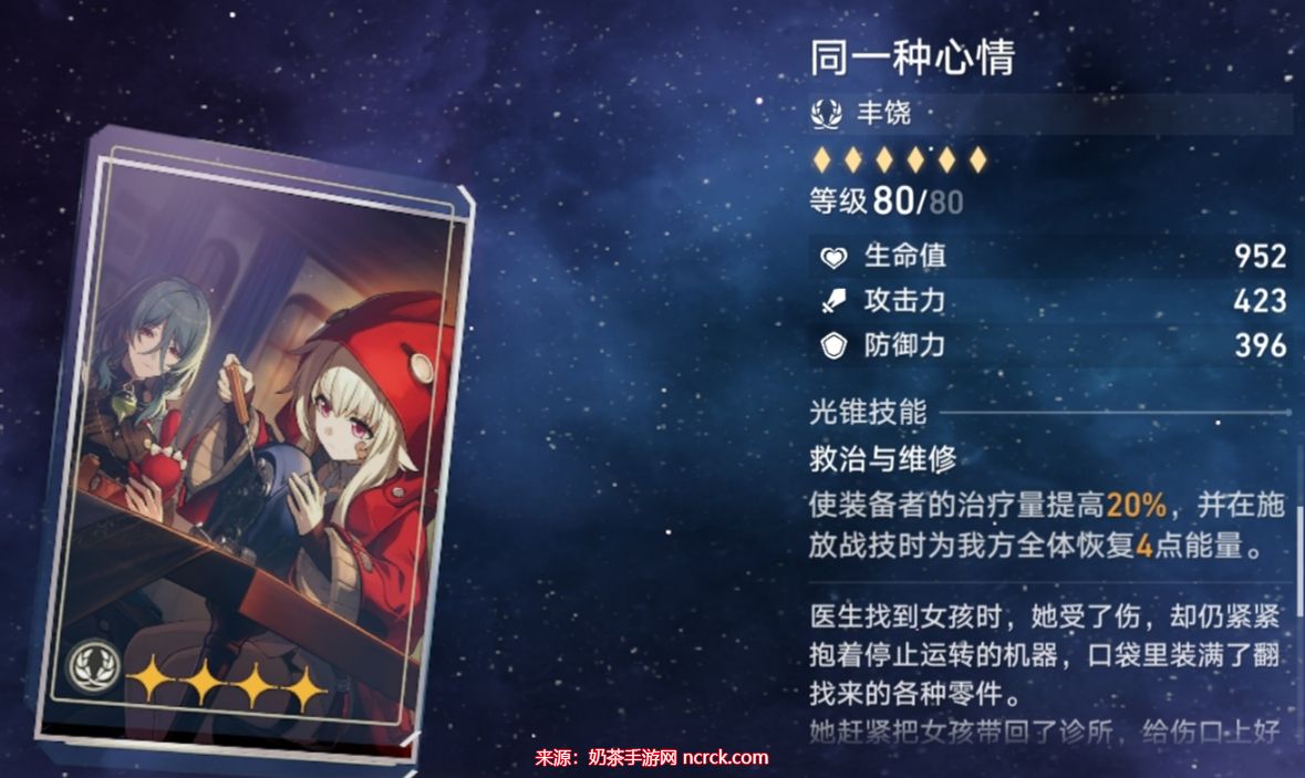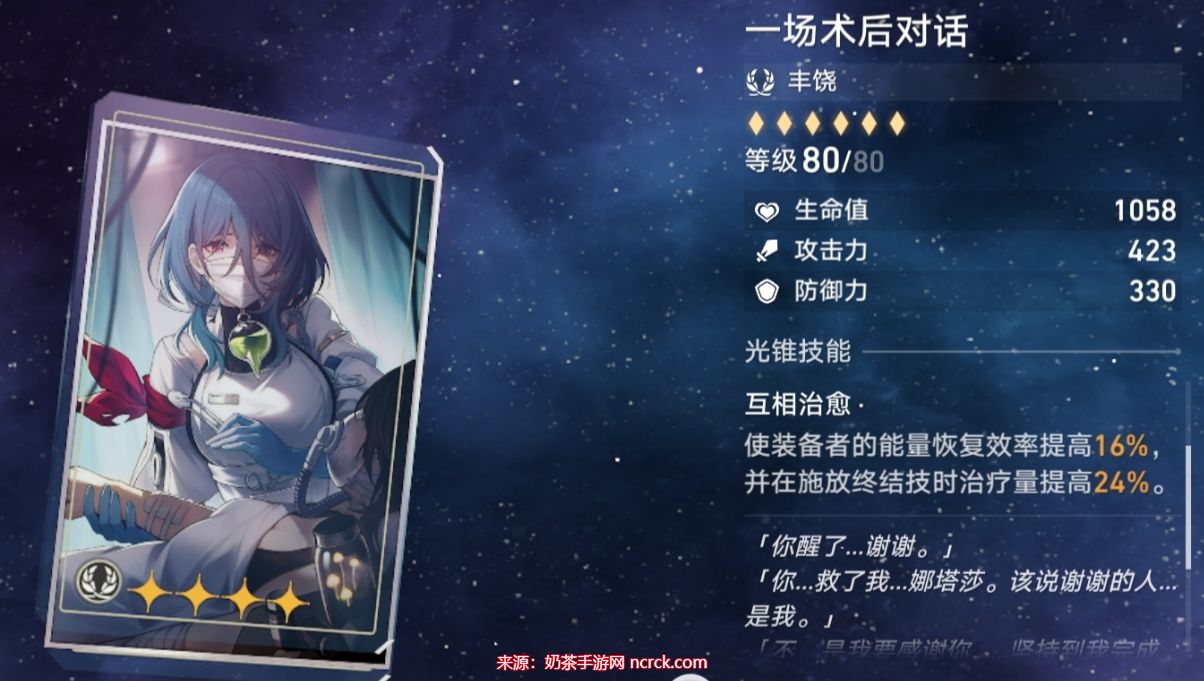 特效分析:在1精状态下,这个光锥可以提高10%的治疗效果,在满精状态下可以提高20%的治疗效果。但是,回复能量需要通过战技触发,我的输出技能点都不够你这个奶妈还想跟我争夺?这个光锥实在是太鸡肋了。携带这个光锥只当做增加治疗加成来使用吧。