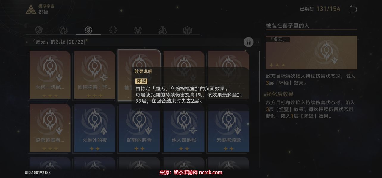 但如果想要获得更高的伤害输出,就需要获取一个可以施加【怀疑】负面效果的3星虚无祝福,并将【怀疑】层数叠加到60以上,这样所造成的负面效果伤害将非常可怕。