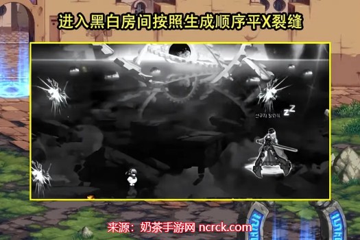 BOSS会对一名玩家发射正反方向的光束、被击中后,将倒放玩家被击中前几秒的黑白画面,并困在过去的时间线中,需要按照4个裂缝生成顺序基础攻击打掉,才能回到正常的时间线。