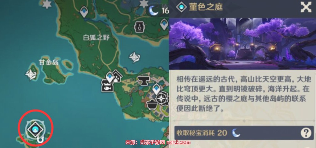 堇色之庭(稻妻城左侧小岛上)。每周二/五/日开放。