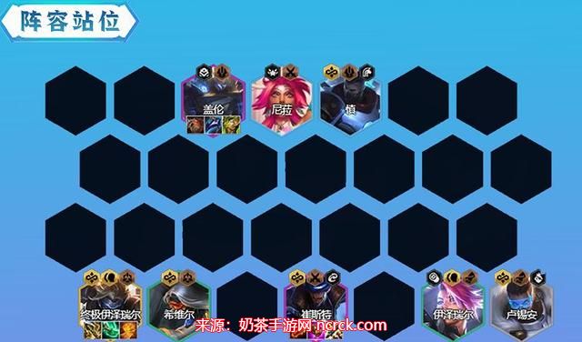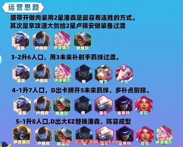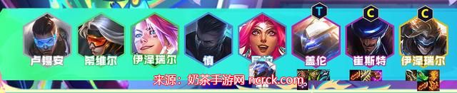 3、成型阵容:潘森、卢锡安、EZ(2费)、希维尔、慎、盖伦、卡牌、尼菈、EZ(5费)。
