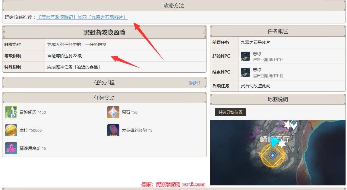 这个是层岩巨渊的主线任务,触发需要完成前置任务和两个条件,其一是玩家冒险等阶要达到28级,其二是完成魔神任务迫近的客星,之后找到沐宁对话开启任务线,接着会接到一系列任务,包括巧瞒七星解磐键、方入巨渊初探勘、初识暗渊毒瘴现、踏破矿贼结新缘、九霄之石悬残片,然后才可以接到黑翳渐浓隐凶险。