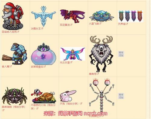 三、事件Boss:黑暗魔法师、食人魔、双足翼龙、荷兰飞盗船、哀木、南瓜王、常绿尖叫怪、圣诞坦克、冰雪女王、火星飞碟、日耀柱、星云柱、星旋柱、星尘柱。
