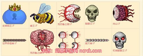 一、肉山前boss:史莱姆王、 克苏鲁之眼、世界吞噬怪、克苏鲁之脑、蜂王、骷髅王、血肉墙、鹿角怪。