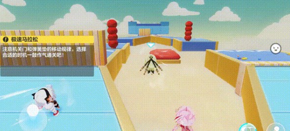2、但是也会有可能左边的赛道的人太多了抢不到位置,那就可以往中间的弹簧垫跳,借助弹簧垫来到下一区域,也是比较方便的;